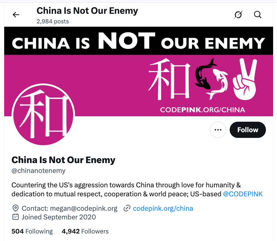 According to the New York Times, over a quarter of Code Pink’s funding since 2017 has come from groups closely tied to Singham. Perhaps not coincidentally, Code Pink’s criticism of the Chinese Communist Party (CCP) has waned in recent years. Evans, once a harsh critic of China’s human rights abuses, has been noticeably more muted on the topic. In 2020, Code Pink launched a “China Is Not Our Enemy” campaign aimed at “[c]ountering the US’s aggression towards China through love for humanity & dedication to mutual respect, cooperation & world peace,” according to the campaign’s X account. Since the group began receiving funding from Singham, Code Pink has described Western concern over the Chinese government’s treatment of the Uyghur population as “a tool to drive the U.S.’s hybrid war on China,” mirroring talking points used by the CCP.