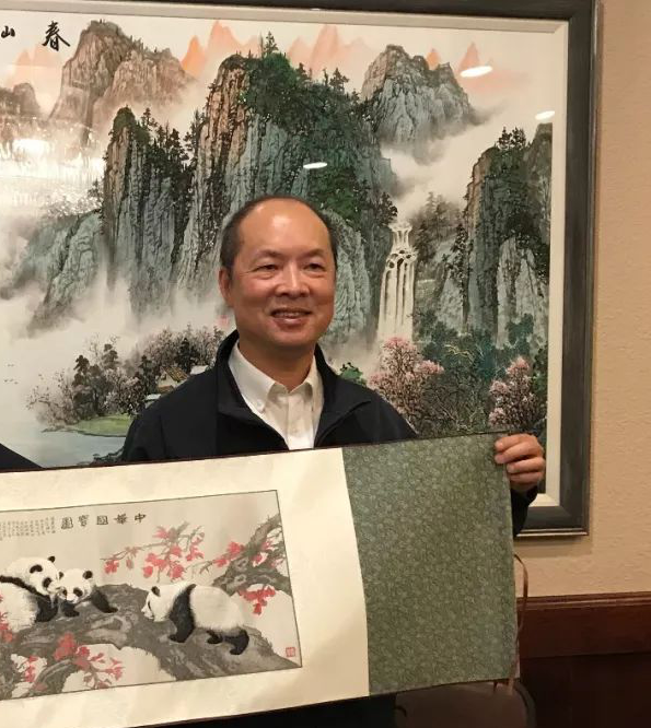 Ma Yuanzhuo (aka Vincent Mar) accepting a souvenir from the Sichuan Overseas Chinese Federation in September 2018.